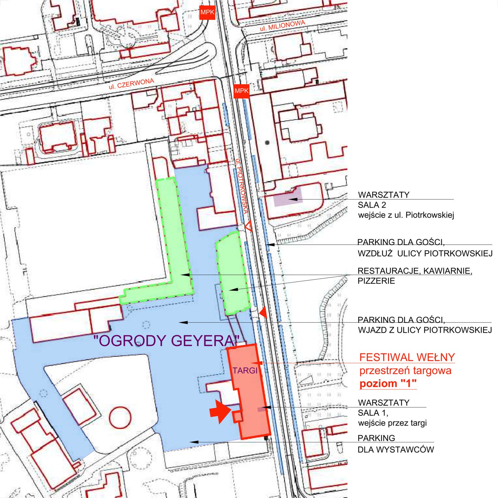 Na terenie Ogrodów Geyera jest parking dla odwiedzających, postój płatny w parkomacie. Wzdłuż ulicy Piotrkowskiej jest parking miejski w sobotę bezpłatny.